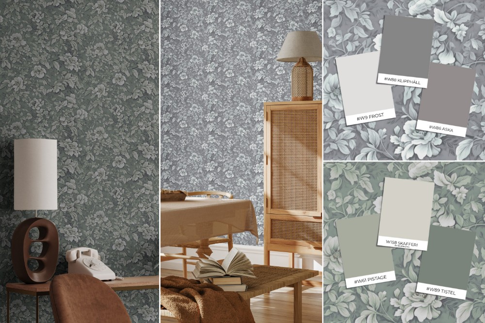 Mønstret er tidløst klassisk med en nordisk følelse og varme farver. Nu fås tapetet Inger også i en sart rosa og en afdæmpet lilla, hvor blomsterne har disse to nuancer i stedet for blå som i originalen. Alle tre farver af tapetet Inger er matchet med malingsfarver, så du kan male møbler, lister og karme, der står ved siden af væggen, hvor du tapetserer med Inger.