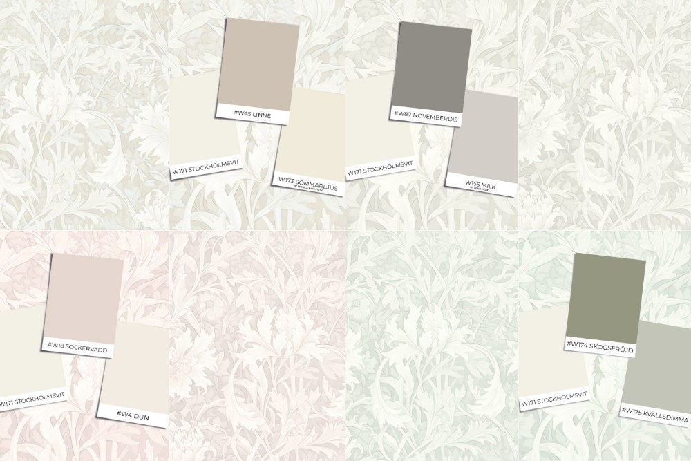 Salvia er en af vores absolut mest elskede tapeter og blev hurtigt en favorit, da den blev lanceret. Derfor lancerer vi nu Salvia i yderligere fire farver: Cream White, Soft Grey, Soft Mint og Soft Pink. Her kan du se, hvilke malingsfarver der passer til hver enkelt tapetfarve.